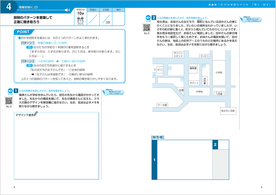 ●「聞く・話す」の音声を聞いて答える問題は、紙面に掲載した二次元コードをスマートフォン等で読み取ることで、音声を再生できます。PC用にURLも記載しています。