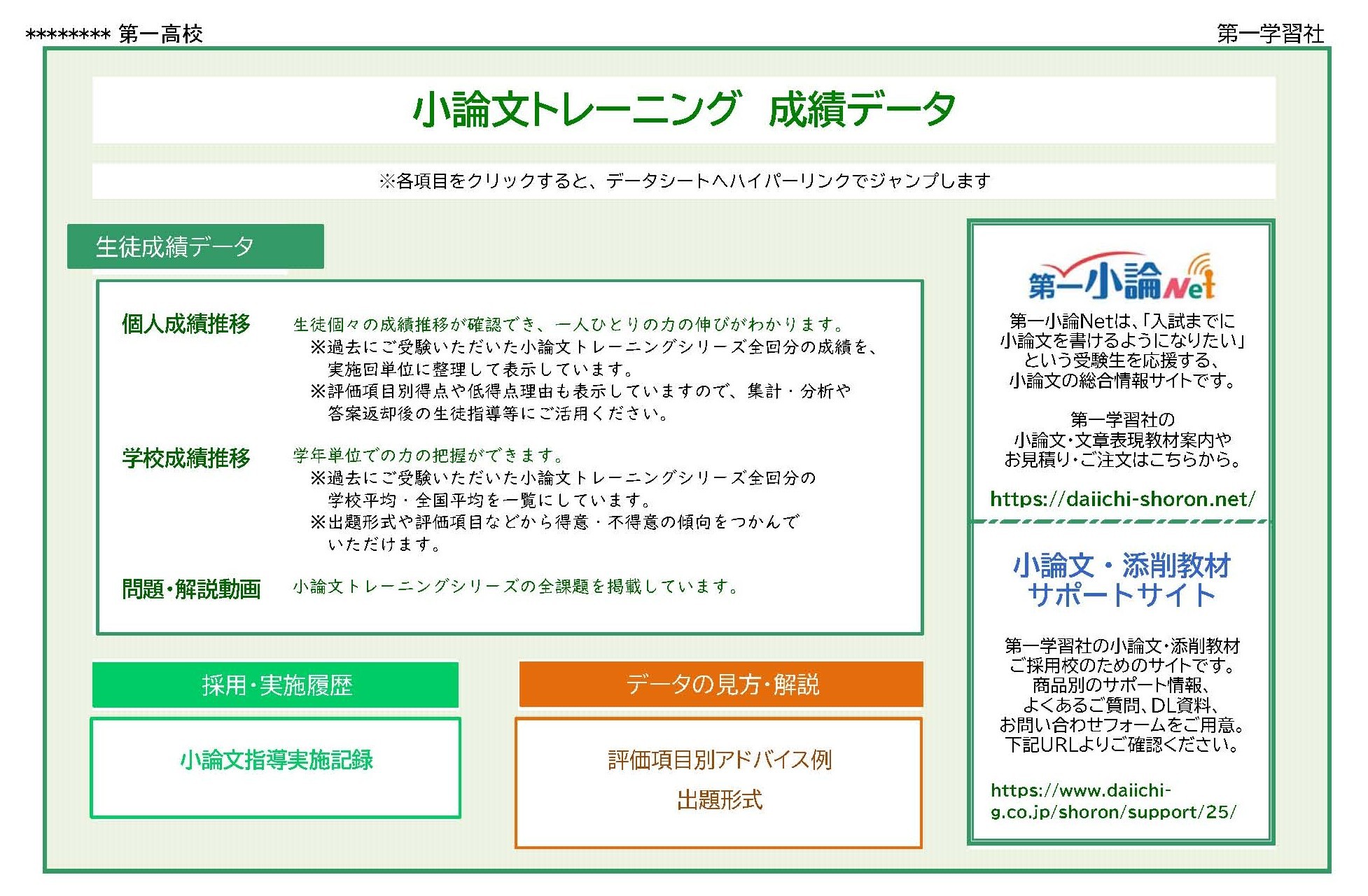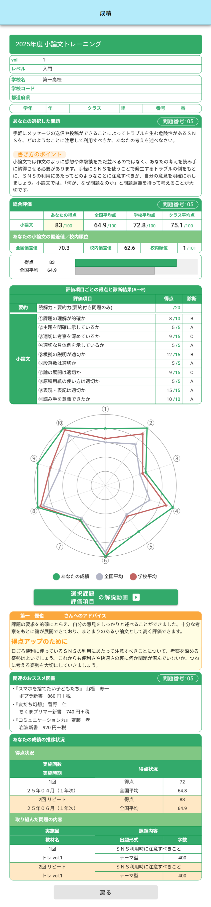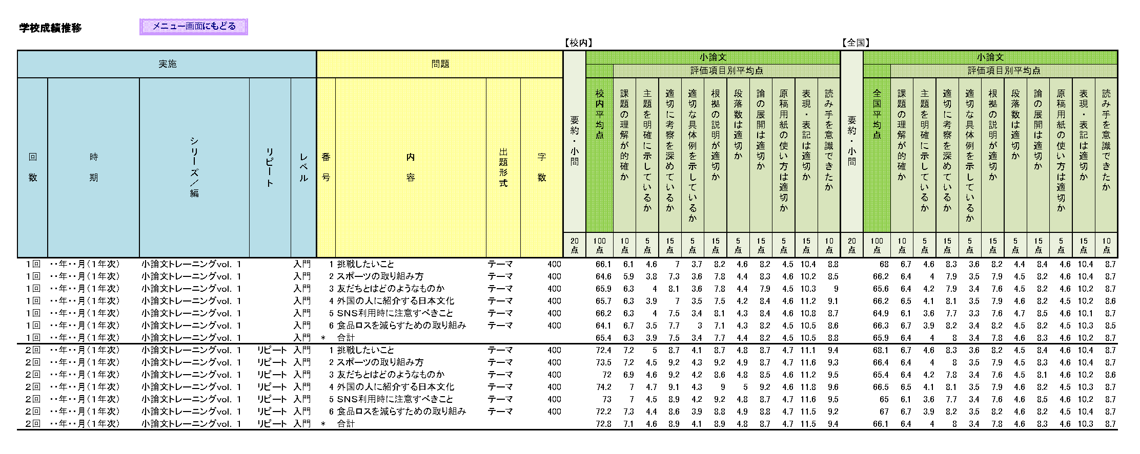 ● 生徒個人別に、入学時から卒業まで、受験していただいた小論文トレーニングシリーズすべての得点・偏差値(全国・校内比較)を表示します。