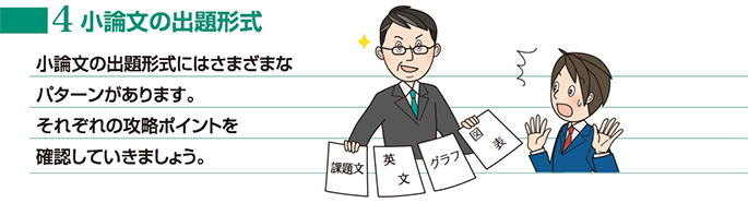 大学入試で課される英語の試験と同様の注意が必要ですが、「小論文試験」として出題されているので、英文中で話題になっていることがらや指示語の内容を日本語でまとめさせる設問が見られることには注意しておいた方がよいでしょう。
