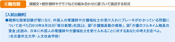 ●与えられた資料を総合的に見て、論点を取り出しましょう。複数の資料はばらばらに読み取るのではなく、総合的にとらえる必要があります。また、それぞれの資料をどのように利用できるか(問題提起として、解決策へのヒントとして、など)を見極め、適切に活用することが重要です。